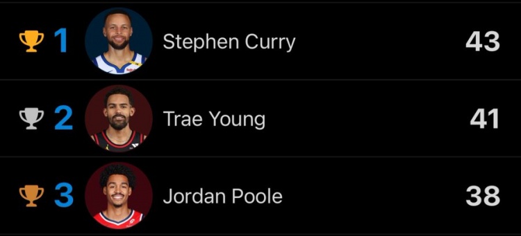 本赛季命中30+英尺投篮球员前3名:库里43记 特雷-杨41 普尔38