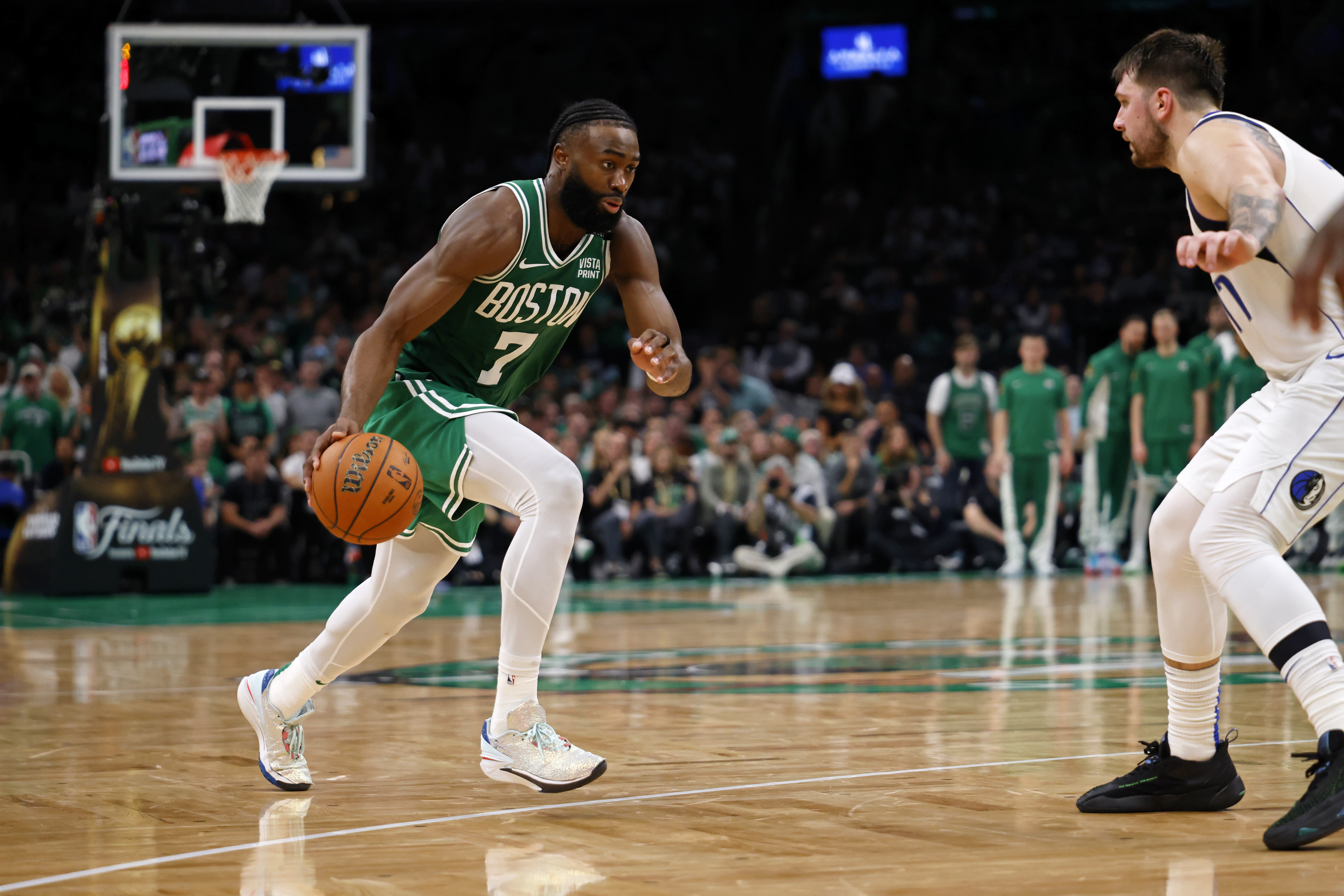 有一段时间,东契奇的表现仿佛重现了去年总决赛的场景(对凯尔特人队而言或许并不遥远)。凯尔特人队早早对东契奇实施包夹,而布朗则在防守端成为核心——不断抢断发起快攻暴扣,并在进攻端消耗东契奇的体力。