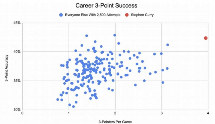 库里的独特之处不仅在于他投的三分球比任何人都多,还在于他能以令人难以置信的效率命中这些三分出手。在职业生涯至少出手2500记三分球的198名球员中,库里的三分命中率排名第三(42.4%),仅次于凯尔-科沃尔和史蒂夫-纳什。
