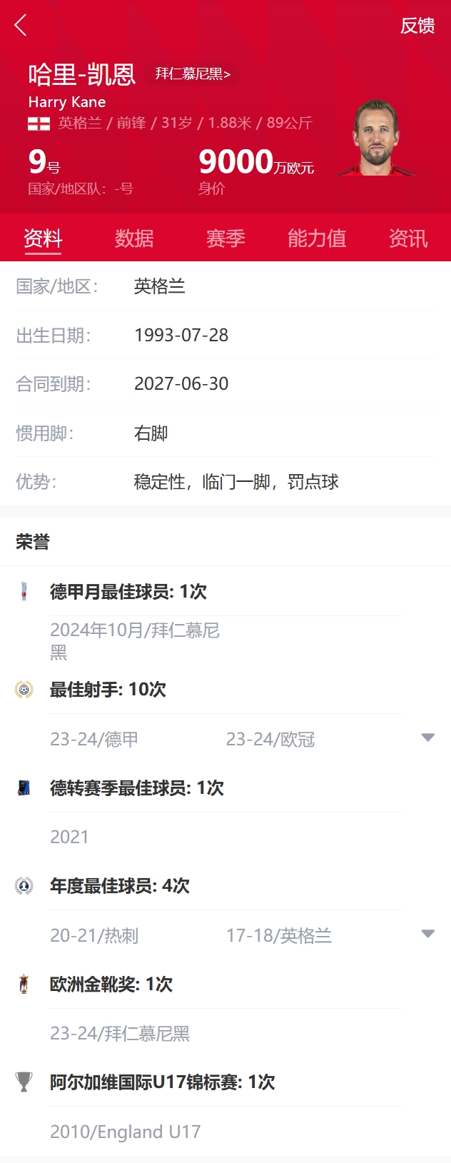 现年31岁的凯恩职业生涯攻入400多粒进球、斩获数十项个人荣誉,但至今还未随球队夺得过主要赛事冠军。