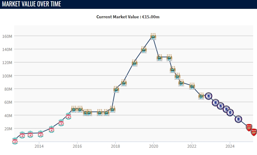 03月18日讯 今日德转更新英超球员身价,阿森纳前锋斯特林身价再跌700万,目前仅为1500万欧元,不足巅峰身价十分之一。