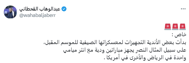 该媒体人写道:一些俱乐部已经开始为下赛季的夏季季前赛做准备。例如,利雅得胜利准备与迈阿密国际进行两场友谊赛,一场在利雅得,一场在美国。