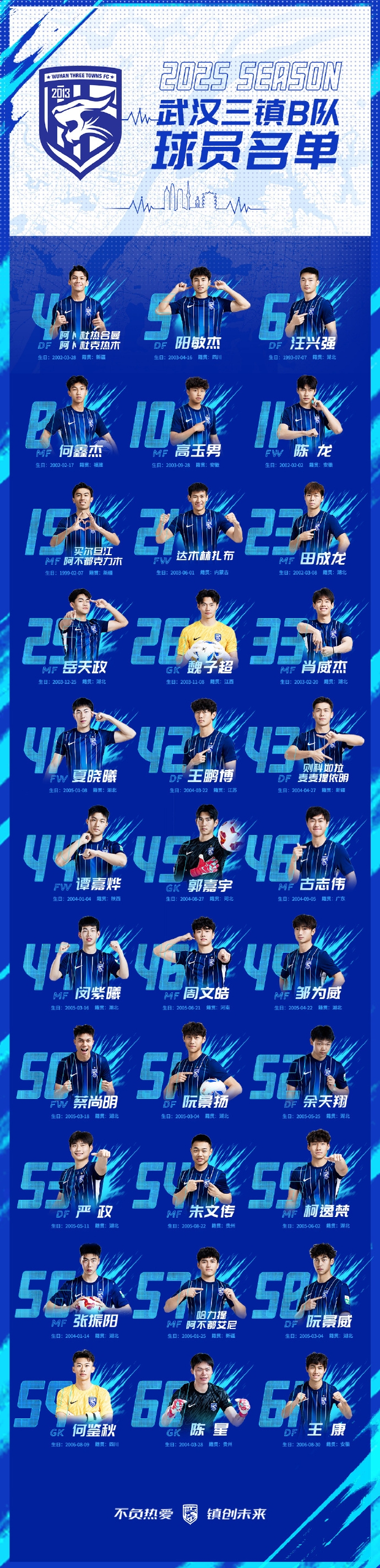 新赛季中乙联赛开战在即,身披上赛季U21联赛冠军的荣光,武汉三镇B队即将踏上崭新的战场。让我们跟随名单去认识各位队员,感受来自三镇的青春力量!