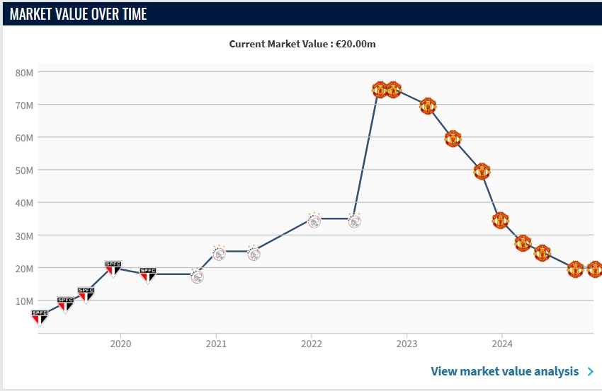 本赛季25岁的安东尼自曼联租借至皇家贝蒂斯后状态火热,为皇家贝蒂斯出场11场已打入4球,并有4次助攻,且多为关键进球,帮助皇家贝蒂斯近期斩获西甲五连胜。可他的身价却与去年12月份相同,仍为2000万欧元。