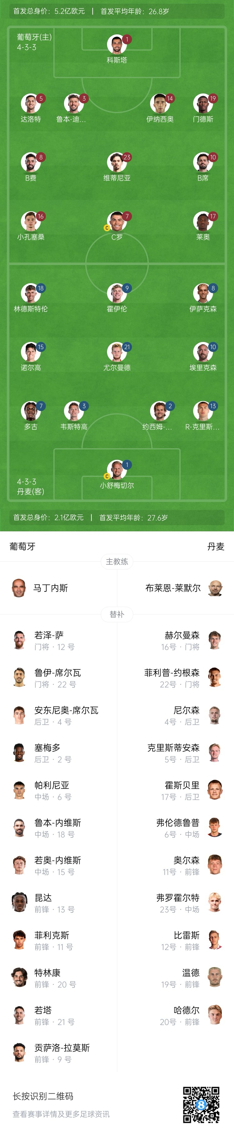 葡萄牙vs丹麦首发:C罗领衔,B费、B席、莱奥先发,霍伊伦出战