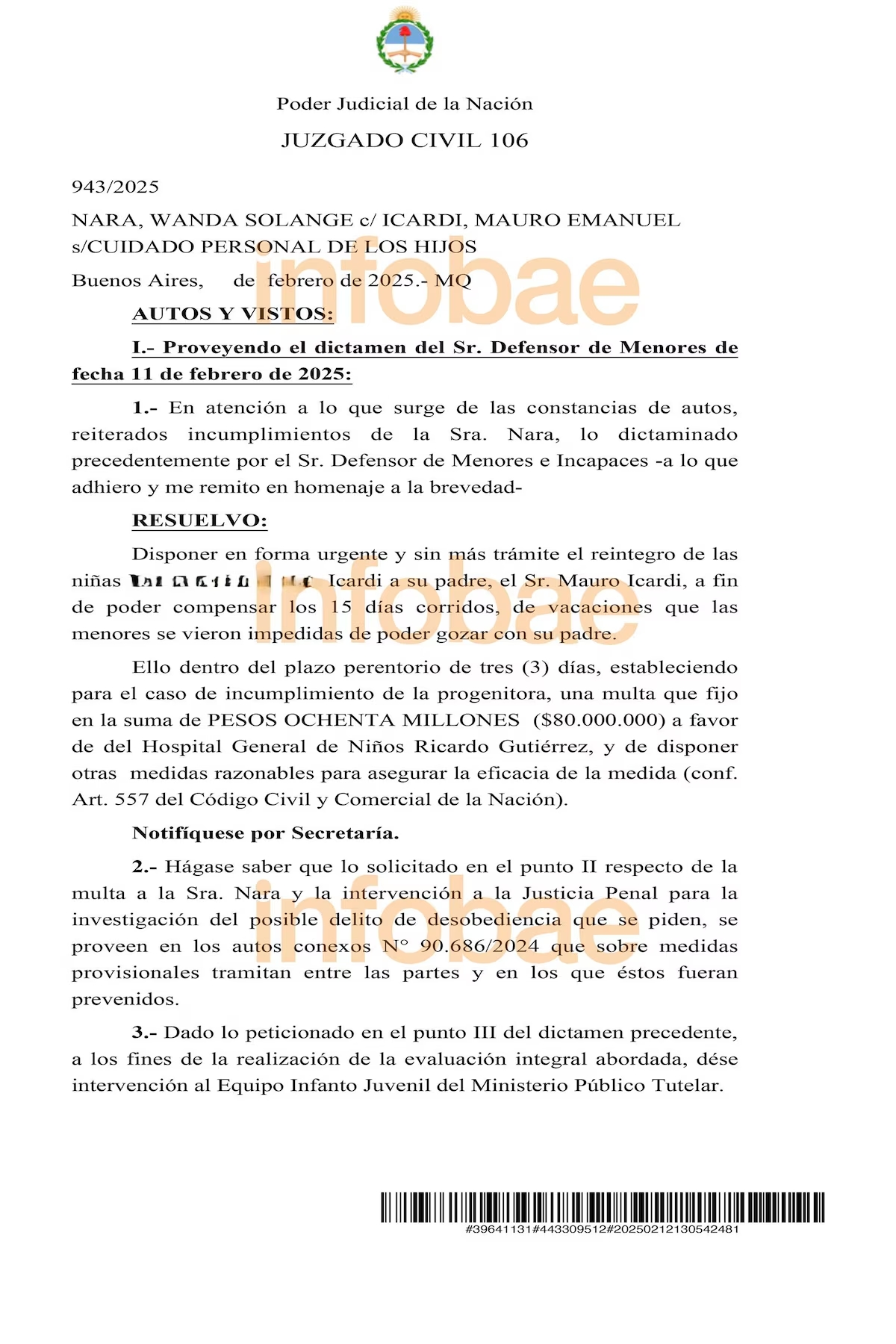 “若母亲未在三天内履行义务,将对其处以8000万比索(约合人民币55.2万元)罚款,款项捐赠至里卡多-古铁雷斯儿童医院。”
