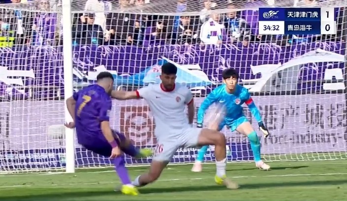 半场-罗斯进球金洋洋飞铲染红 天津津门虎1-0领先十人青岛海牛