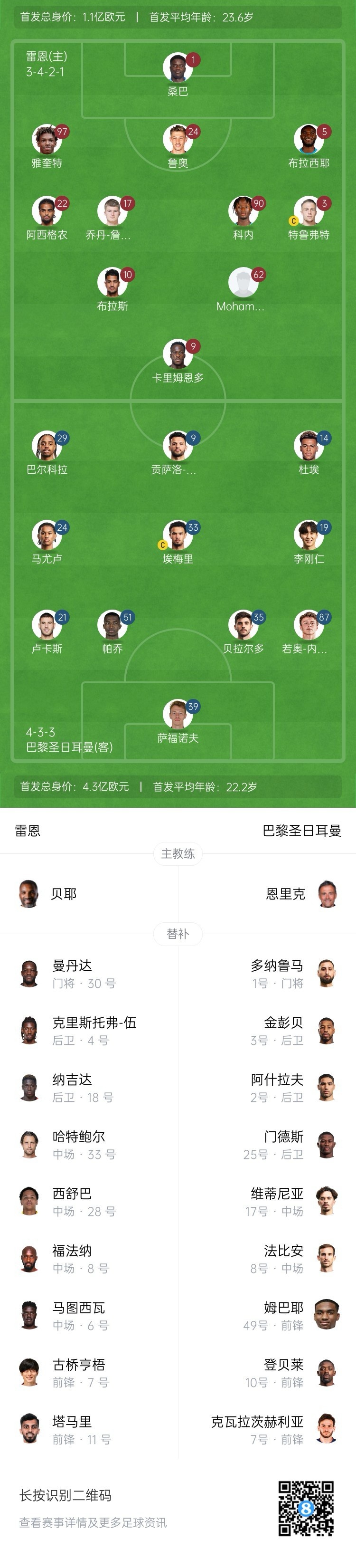雷恩首发:1-桑巴、97-雅奎特、24-鲁奥、5-布拉西耶、22-阿西格农、17-乔丹-詹姆斯、90-科内、3-特鲁弗特、10-布拉斯、62-梅特、9-卡里姆恩多