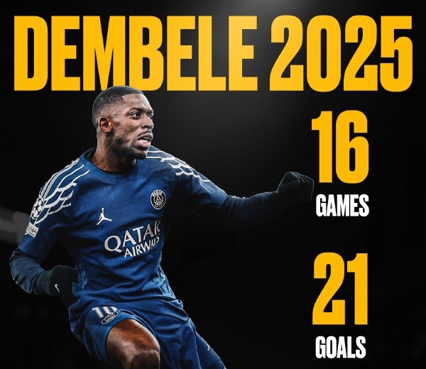 进入2025年之后,登贝莱16场比赛打入21球,这项数据是五大联赛球员里第一名。