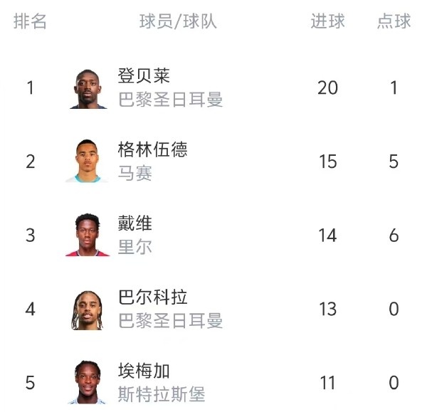 从统计数据上可以看到,登贝莱在法甲射手榜上已经建立起5球的领先优势。更不要说他20个法甲联赛进球里,只有1次点球破门。