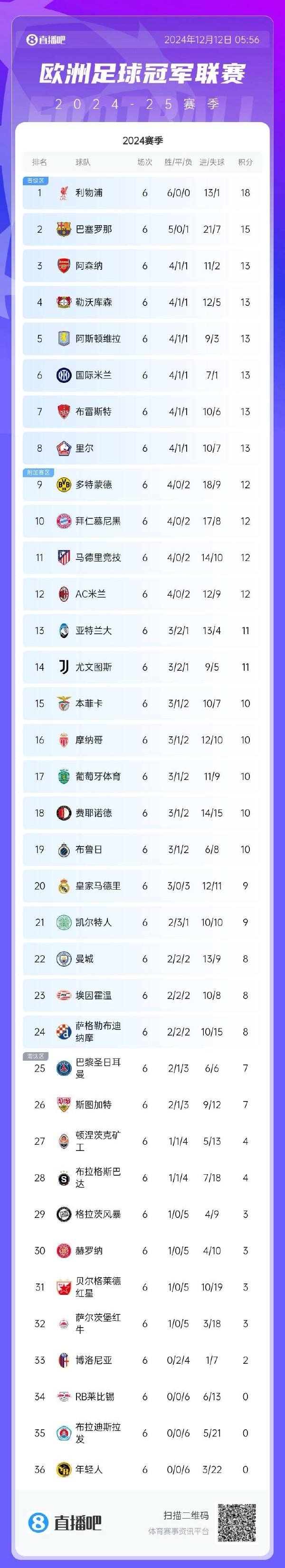 如果将时间倒回至欧冠联赛轮第6比赛日结束后,当时巴黎圣日尔曼排在所有球队里的第25名。